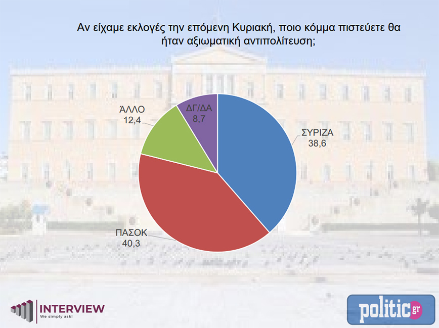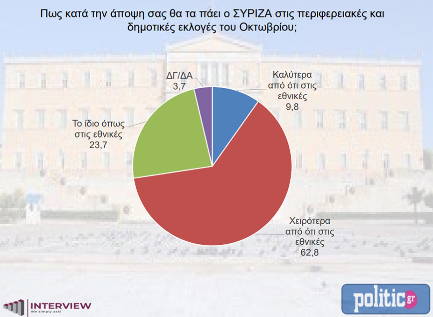 Αξίζει να σημειωθεί πως οι περισσότεροι στο σύνολο των ψηφοφόρων εκτιμούν πως σε περίπτωση εκλογών την επόμενη Κυριακή, αξιωματική αντιπολίτευση θα αναδεικνυόταν το ΠΑΣΟΚ και όχι ο ΣΥΡΙΖΑ. Ειδικότερα το ΠΑΣΟΚ συγκεντρώνει το 40,3% και ο ΣΥΡΙΖΑ το 38,6%. Οι αρνητικές προοπτικές για τον ΣΥΡΙΖΑ καταγράφονται και στην ερώτηση για τις περιφερειακές και δημοτικές εκλογές του Οκτωβρίου, καθώς το 62,8% εκτιμά πως θα τα πάει χειρότερα σε σχέση με τις εθνικές εκλογές. Αντίθετα, το 23,7% πιστεύει ότι θα τα πάει το ίδιο και το 9,8% καλύτερα.
