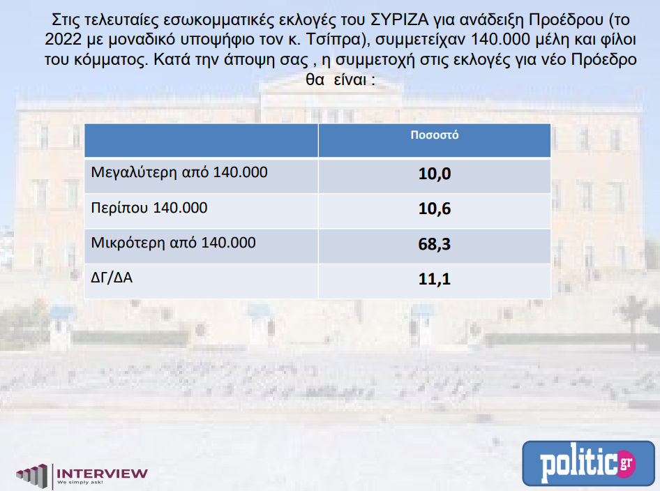 Τέλος, σχετικά με τη συμμετοχή των μελών και φίλων του ΣΥΡΙΖΑ που θα συμμετέχουν στην εσωκομματική διαδικασία, το μεγαλύτερο ποσοστό των ερωτηθέντων (68,3%) απαντάει πως η συμμετοχή θα κινηθεί κάτω από τις 140.000, αριθμός ορόσημο που είχε καταγραφεί στην εκλογή του Αλέξη Τσίπρα. Ένα 10% πιστεύει πως η συμμετοχή θα είναι μεγαλύτερη των 140.000 και το10,6% εκτιμά πως ο αριθμός των μελών και φίλων που θα συμμετάσχουν θα είναι περίπου η ίδια.