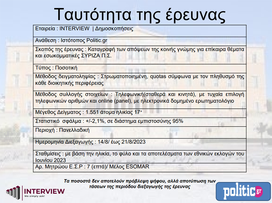 Δημοσκόπηση της Interview για λογαριασμό της POLITIC καταγράφει τις τάσεις στο εσωτερικό του κόμματος και τα φαβορί για την προεδρία. Σημειώνεται πως στην έρευνα δεν αναφέρεται το όνομα του κ. Κασσελάκη, καθώς δεν έχει γίνει κάποια επίσημη ανακοίνωση για την υποψηφιότητά του. Αυτό θα μπορούσε να συμβεί έως τις 2 Σεπτεμβρίου, όταν οι υποψηφιότητες θα εγκριθούν και τυπικά από το Διαρκές Συνέδριο του κόμματος. Στόχος στον ΣΥΡΙΖΑ είναι το κόμμα να εκπροσωπηθεί στη ΔΕΘ, στις 17 Σεπτεμβρίου, από το νέο αρχηγό.