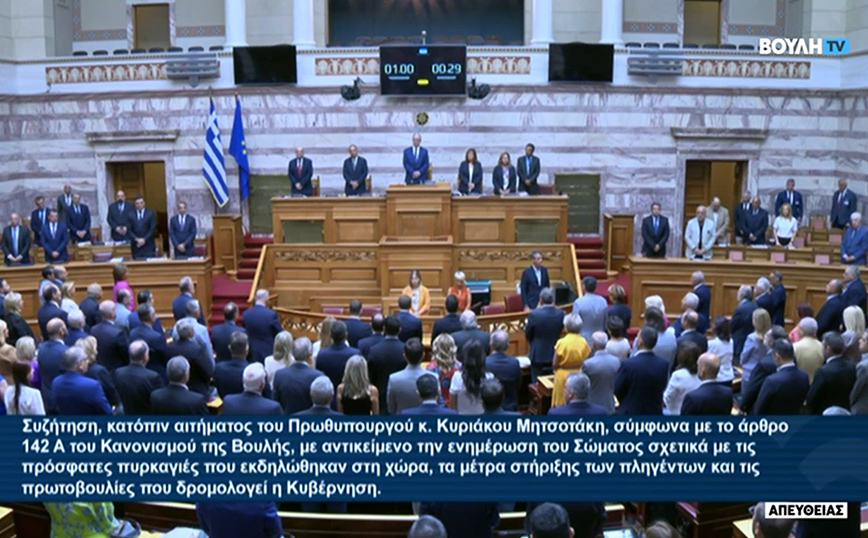 Σημειώνεται πως πριν από την ομιλία του πρωθυπουργού και ύστερα από αίτημα του προέδρου του ΠΑΣΟΚ, Νίκου Ανδρουλάκη, η Βουλή τήρησε ενός λεπτού σιγή για τα θύματα των πρόσφατων πυρκαγιών.