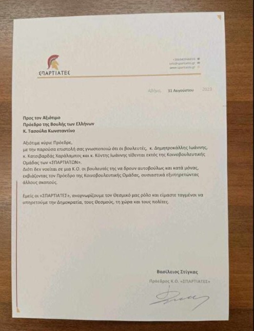 Μετά την επίθεση που εξαπέλυσε ο επικεφαλής της Κοινοβουλευτικής Ομάδας των Σπαρτιατών στους ίδιους τους βουλευτές του και το αίτημα του Προέδρου της Βουλής, να ενημερωθεί για το αν υπάρχει ή όχι η εν λόγω Κοινοβουλευτική Ομάδα, ο Βασίλης Στίγκας προχώρησε στις τρεις πρώτες διαγραφές.