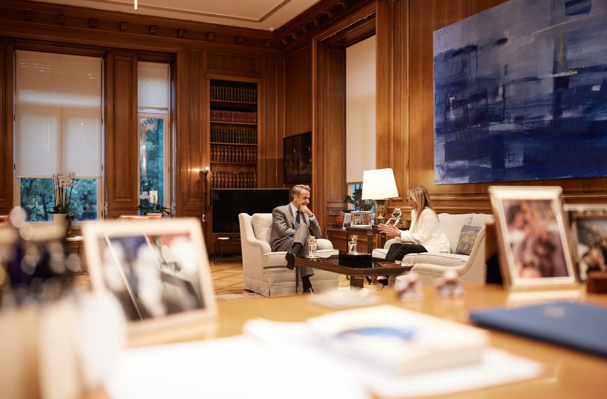 Ο Πρωθυπουργός Κυριάκος Μητσοτάκης παρέθεσε δείπνο εργασίας στο Μέγαρο Μαξίμου στην Πρωθυπουργό της Ιταλίας Τζόρτζια Μελόνι. Κατά τη διάρκεια του δείπνου εργασίας, ο Κυριάκος Μητσοτάκης και η Giorgia Meloni συζήτησαν για την εμβάθυνση και διεύρυνση των ήδη ισχυρών διμερών σχέσεων, ιδιαίτερα στην οικονομία.