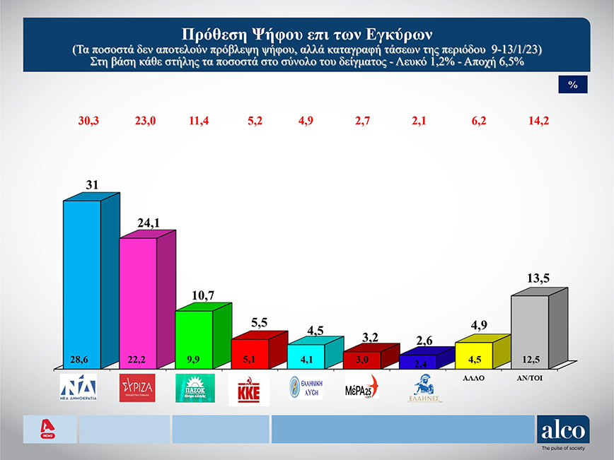 Την πορεία ενδυνάμωσης ΝΔ και ΣΥΡΙΖΑ καταγράφουν οι δύο τελευταίες δημοσκοπήσεις της Opinion Poll και της Alco, χωρίς να καταγράφεται ταυτόχρονα κάποια μεγάλη μείωση της διαφοράς. Συγκεκριμένα προβάδισμα 7,8% εμφανίζει η Νέα Δημοκρατία έναντι του ΣΥΡΙΖΑ στην πρόθεση ψήφου στο πρώτο γκάλοπ, ενώ στο δεύτερο η διαφορά αποτυπώνεται στις 6,9 μονάδες (από 7,3 τον Νοέμβριο), Ακολουθούν το ΠΑΣΟΚ/ΚΙΝΑΛ με 10,7%, το ΚΚΕ με 5,5%, η Ελληνική Λύση με 4,5% και το ΜέΡΑ25 με 3,2%. Και στις δύο δημοσκοπήσεις απώλειες καταγράφει το ΠΑΣΟΚ- ΚΙΝΑΛ, ενώ η Ελληνική Λύση «τσιμπάει» προς τα πάνω. Στην ερώτηση ποιον πολιτικό αρχηγό εμπιστεύεστε περισσότερο, ο Κυριάκος Μητσοτάκης προηγείται με 32% έναντι 22% για τον Αλέξη Τσίπρα, με το κανένα να συγκεντρώνει 23% στη δημοσκόπηση της Alco (για τον Alpha).