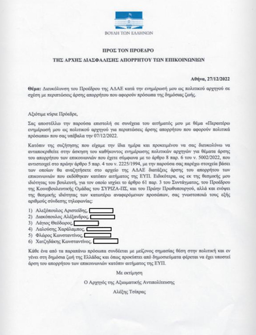 «Όσο για την αξιοθρήνητη προσπάθεια του κ. Μητσοτάκη ακόμα και σήμερα να πείσει πως τα ονόματα των 6 παρακολουθούμενων (Χατζηδάκη, Φλώρου, Λαλούση, Διακόπουλου, Λάγιου και Αλεξόπουλου) δεν τα γνώριζε και δεν ήταν στην απαντητική επιστολή του κ. Ράμμου, επισυνάπτουμε το επίσημο αίτημα που είχε υποβάλει ο κ. Τσίπρας στον Πρόεδρο της ΑΔΑΕ» αναφέρουν οι πηγές του ΣΥΡΙΖΑ.