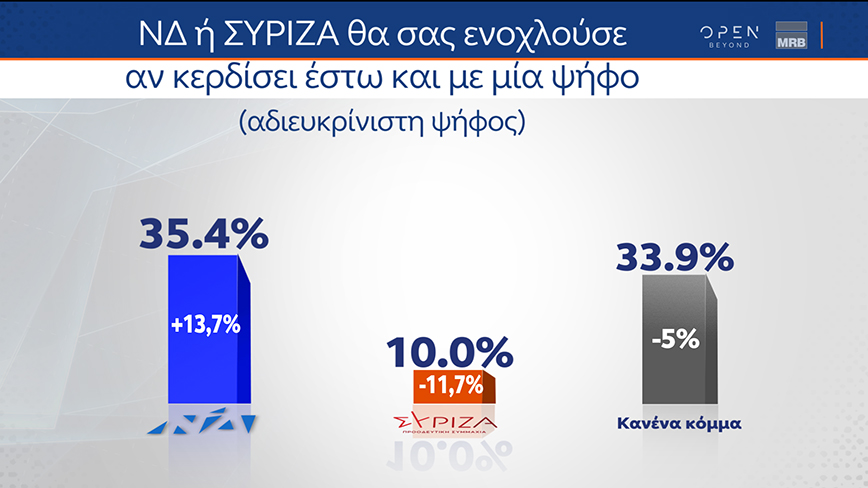 Στο δεύτερο μέρος της δημοσκόπησης της MRB για το OPEN, όπου η διαφορά της ΝΔ με τον ΣΥΡΙΖΑ βρίσκεται στις 5,9 μονάδες, σκιαγραφήθηκε η τάση των αναποφάσιστων πολιτών ενόψει των εκλογών.