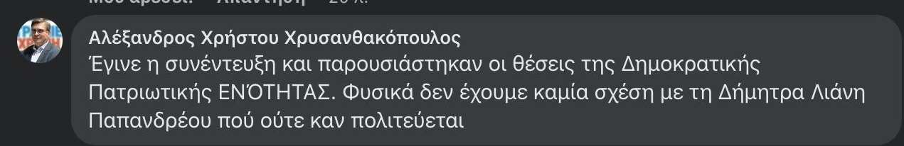 Η κα. Λιάνη δεν ήταν παρούσα στην εκδήλωση του Κόμματος, με τον Αλέξανδρο Χρήστου Χρυσανθακόπουλο να αναφέρει σε σχόλιο κάτω από την ανάρτηση του Γιάννη Ευσταθίου: «Έγινε η συνέντευξη και παρουσιάστηκαν οι θέσεις της Δημοκρατικής Πατριωτικής Ενότητας. Φυσικά δεν έχουμε καμία σχέση με τη Δήμητρα Λιάνη Παπανδρέου που ούτε καν πολιτεύεται».