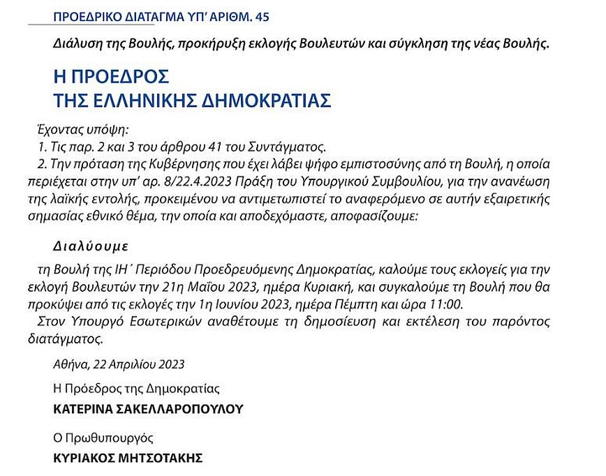 Έγινε η θυροκόλληση του προεδρικού διατάγματος για τη διάλυση της Βουλής, πράξη που σηματοδοτεί και επισήμως την έναρξη της προεκλογικής περιόδου μέχρι τις εκλογές της 21ης Μαΐου. Προηγήθηκε η συνάντηση του πρωθυπουργού με την Πρόεδρο της Δημοκρατίας, Κατερίνα Σακελλαροπούλου και το διάγγελμα του Κυριάκου Μητσοτάκη.