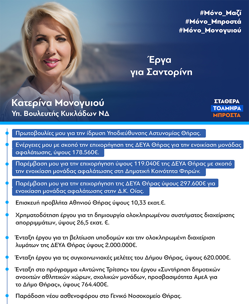 Με επισκέψεις σε Σαντορίνη, Σίκινο και Φολέγανδρο συνεχίζει τις περιοδείες της στις Κυκλάδες η υποψήφια βουλευτής της Νέας Δημοκρατίας κα Κατερίνα Μονογυιού. Ειδικότερα, η νεαρή πολιτικός, που μετράει ήδη τέσσερα χρόνια κοινοβουλευτικής θητείας, επισκέφθηκε τη Σαντορίνη, όπου παρέστη στο 1ο Διεθνές Συνέδριο Πολυτελούς Τουρισμού.