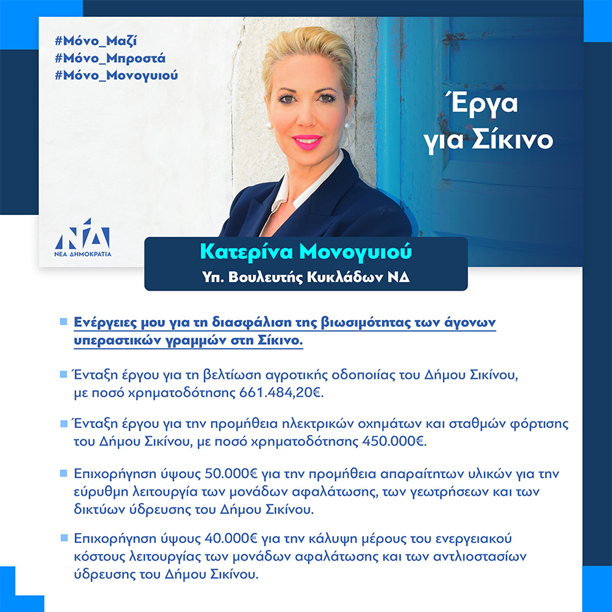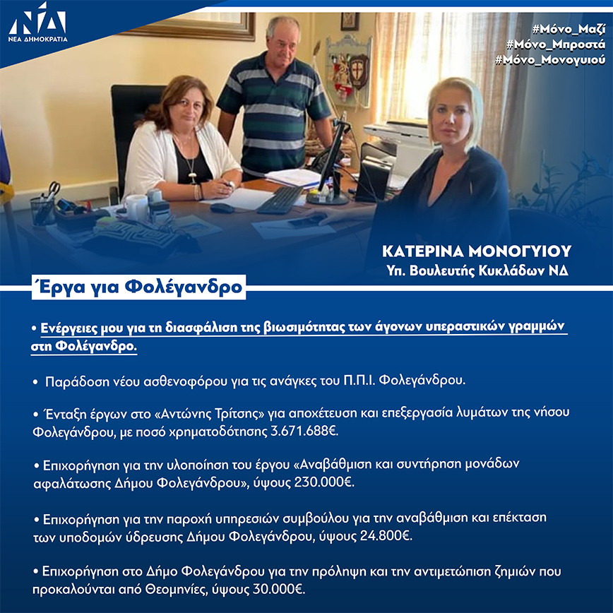 Σε συνεργασία με τους Δημάρχους, η Κατερίνα Μονογυιού πρωτοστάτησε στη δημιουργία των Υποδιευθύνσεων Αστυνομίας στη Μύκονο και τη Σαντορίνη. Παράλληλα, το διάστημα 2019-2023 έκανε μία σειρά παρεμβάσεων με σκοπό την παροχή επιχορηγήσεων στην ΔΕΥΑ Θήρας με σκοπό τις ενοικιάσεις μονάδων αφαλάτωσης στη Θήρα, στις δημοτικές κοινότητες Φηρών και Οίας, συνολικού ύψους 595.200 ευρώ.