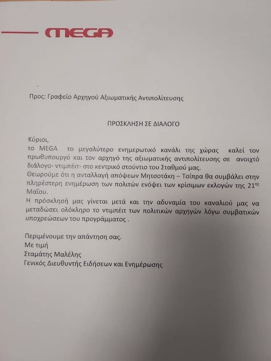 Ωστόσο, στα γραφεία του πρωθυπουργού Κυριάκου Μητσοτάκη και του Αλέξη Τσίπρα έφτασε μια επιστολή από τον διευθυντή ενημέρωση του Mega, Σταμάτη Μαλέλη. Η επιστολή αφορά τη διεξαγωγή ενός ακόμα ντιμπέιτ, αυτή τη φορά διπλού, ανάμεσα στον πρωθυπουργό και τον πρόεδρο του ΣΥΡΙΖΑ το οποίο θα φιλοξενηθεί στο Mega.