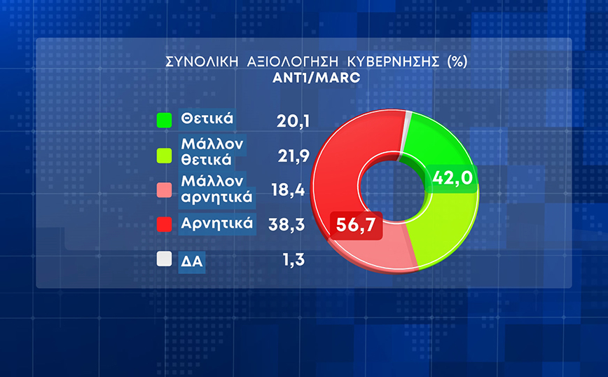 Στην αξιολόγηση της κυβέρνησης οι πολίτες απαντούν πως είναι θετική ή μάλλον θετική σε ποσοστό 42%, ενώ 56,7% απάντησαν ότι είναι αρνητική ή μάλλον αρνητική.