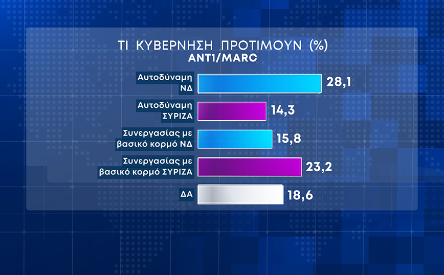 Για το τι κυβέρνηση θα ήθελαν μετά τις εκλογές το 28,1% θέλει αυτοδύναμη ΝΔ, το 14,3% αυτοδύναμο ΣΥΡΙΖΑ, το 15,8% συνεργασίας με κεντρικό κορμό της ΝΔ, το 23,2% συνεργασίας με κεντρικό κορμό τον ΣΥΡΙΖΑ, ενώ το 18,6% δεν απάντησε.
