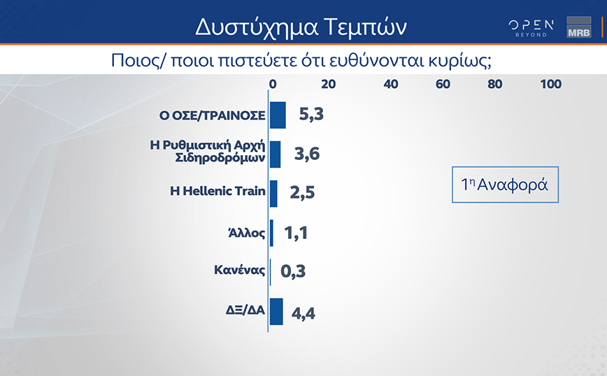 Στη δημοσκόπηση της MRB για το κεντρικό δελτίων ειδήσεων του OPEN η διαφορά της Νέας Δημοκρατίας από τον ΣΥΡΙΖΑ βρίσκεται στις 3,2 μονάδες. Ερωτήματα τέθηκαν στους πολίτες σχετικά με το δυστύχημα των Τεμπών, τις ευθύνες, αλλά και πόσο θα τους επηρεάσει στην ψήφο τους.