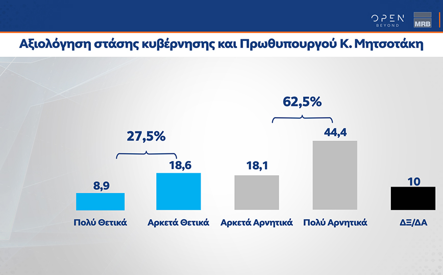 Το 27,5% αξιολογεί θετικά τον πρωθυπουργό μετά την «συγγνώμη» για την τραγωδία των Τεμπών, έναντι 62,5% που τον αξιολογεί αρνητικά. Το 10% απάντησε ΔΞ/ΔΑ.