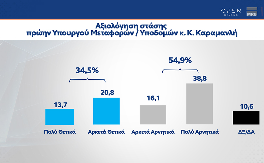 Παράλληλα το 34,5% αξιολογεί θετικά τον πρώην υπουργό Μεταφορών, Κώστα Καραμανλή, σε αντίθεση με το 54,9%.