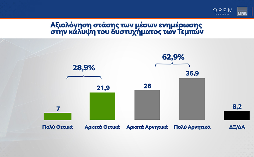 Για την στάση των ΜΜΕ στην τραγωδία των Τεμπών, το 28,9% αξιολόγησε θετικά το πώς παρουσίασαν τα Μέσα το δυστύχημα, με το 62,9% να τα αξιολογεί αρνητικά.