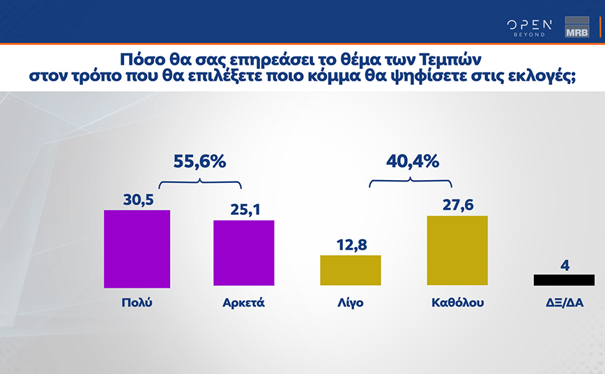 Οι ψηφοφόροι ρωτήθηκαν πόσο θα επηρεάσει την ψήφο σας η τραγωδία των Τεμπών το 55,6% απάντησε πολύ ή αρκετά, ενώ το 40,4% είπε λίγο έως καθόλου.