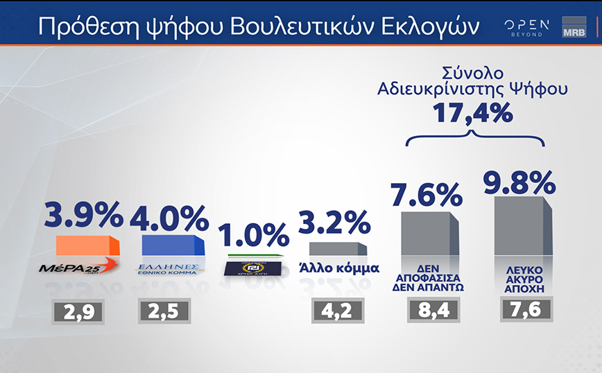Στην πρόθεση ψήφου με αναγωγή επί των εγκύρων η Νέα Δημοκρατία συγκεντρώνει 30,4%, ο ΣΥΡΙΖΑ 27,2%, το ΠΑΣΟΚ 10%, το ΚΚΕ 5,7%, η Ελληνική Λύση 5%, το ΜέΡΑ 25 4,3%, οι Έλληνες 4,4%, η Χ.Α. 1,1%, άλλο κόμμα 3,5%, δεν έχω αποφασίσει 8,4%.