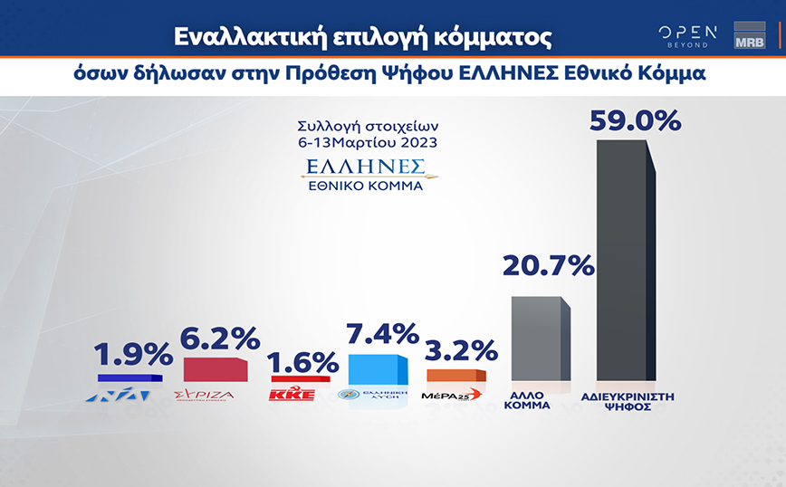 Όσο για το κόμμα του Ηλία Κασιδιάρη «Έλληνες» και ποια είναι η εναλλακτική όσων θέλουν να το ψηφίσουν, τα ποσοστά έχουν ως εξής: ΝΔ 1,9%, ΣΥΡΙΖΑ 6,2%, ΚΚΕ 1,6%, Ελληνική Λύση 7,4%, ΜέΡΑ 25 3,2%, άλλο κόμμα 20,7%, αδιευκρίνιστη ψήφος 59%.