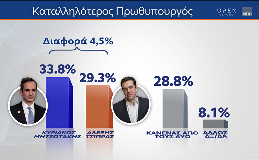 Στο ερώτημα ποιος είναι καταλληλότερος για πρωθυπουργός το 33,8% είπε τον Κυριάκο Μητσοτάκη, το 29,3% τον Αλέξη Τσίπρα, το 28,8% τον «κανέναν», άλλος ΔΞ/ΔΑ 8,1%.