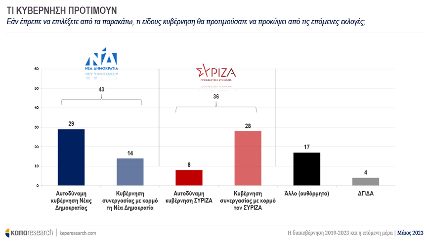 Σύμφωνα με την έρευνα, οι πολίτες προτιμούν να προκύψει αυτοδύναμη κυβέρνηση Νέας Δημοκρατίας σε ποσοστό 29%, ενώ κυβέρνηση συνεργασίας με κορμό τη ΝΔ επιθυμεί το 14%. Αντίστοιχα αυτοδύναμη κυβέρνηση ΣΥΡΙΖΑ θέλει το 8%, ενώ το 28% επιθυμεί μια κυβέρνηση συνεργασίας με κορμό τον ΣΥΡΙΖΑ.