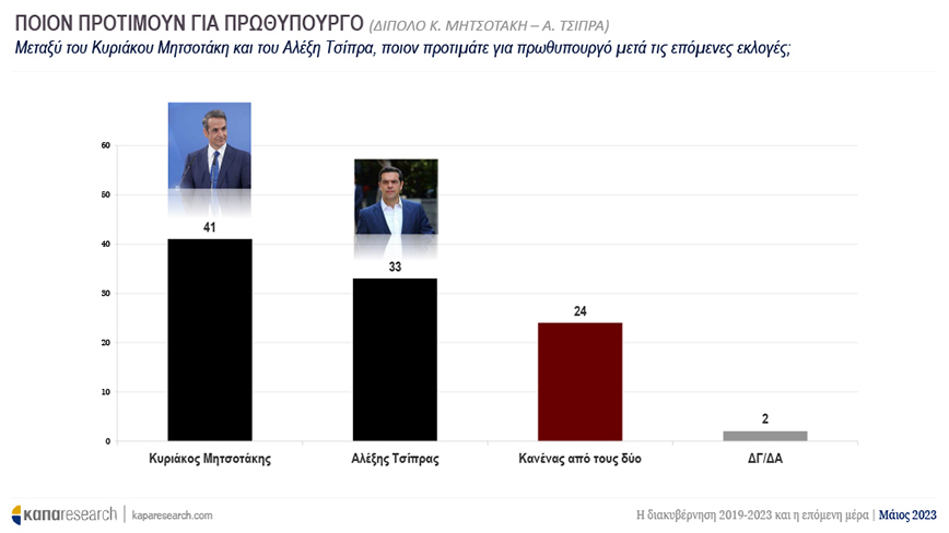 Στην ερώτηση ποιον προτιμούν για πρωθυπουργό, οι ψηφοφόροι απαντούν Κυριάκο Μητσοτάκη σε ποσοστό 41% και Αλέξη Τσίπρα σε ποσοστό 33%.