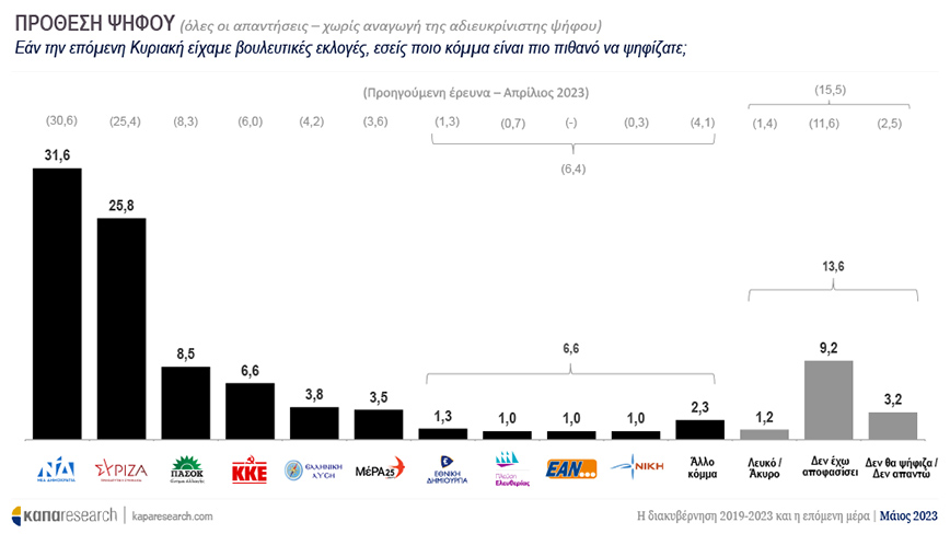 Στις 5,8 ποσοστιαίες μονάδες καταγράφεται η διαφορά μεταξύ Νέας Δημοκρατίας και ΣΥΡΙΖΑ σε δημοσκόπηση της Kapa Research. Συγκεκριμένα στην πρόθεση ψήφου, η Νέα Δημοκρατία βρίσκεται στο 31,6% ενώ ο ΣΥΡΙΖΑ στο 25,8%.