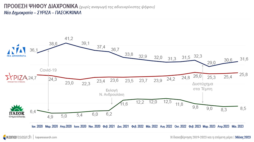 Στο διάγραμμα της πρόθεσης ψήφου διαχρονικά η μεγαλύτερη διαφορά μεταξύ Νέας Δημοκρατίας και ΣΥΡΙΖΑ φαίνεται να καταγράφεται τον Απρίλιο του 2020 όταν οι μονάδες της διαφοράς τους καταγράφονται στις 18.