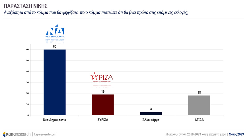 Στην παράσταση νίκης η Νέα Δημοκρατία συγκεντρώνει ποσοστό 60%, ενώ ο ΣΥΡΙΖΑ ακολουθεί με 19%.