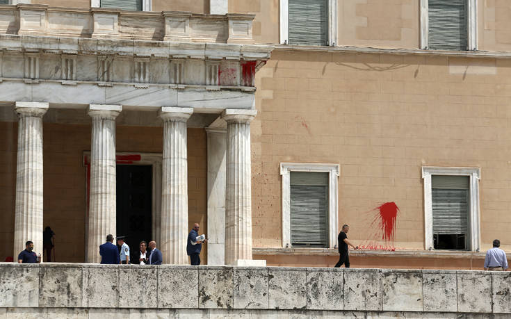 Λίγες στιγμές μετά την επίθεση του Ρουβίκωνα στη Βουλή με μπογιές και καπνογόνα πλήθος κόσμου έσπευσε να φωτογραφίσει τους κόκκινους τοίχους.