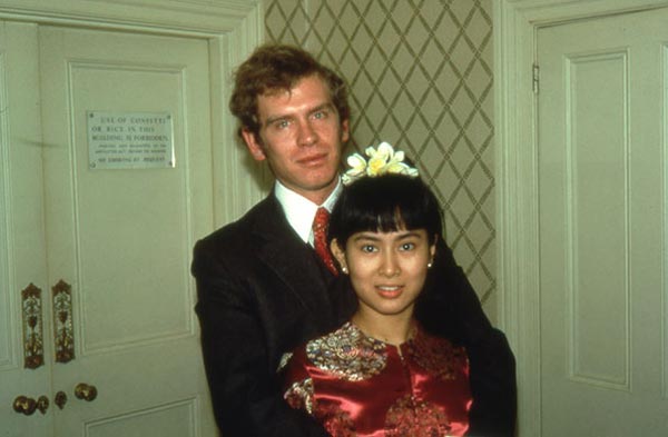 Στα τέλη του 1971 έρχεται ο γάμος της με τον Dr. Michael Aris, με τον οποίο αποκτά δύο παιδιά (το 1973 και το 1977). Η οικογένεια περνά τις δεκαετίες του ’70 και του ’80 στην Αγγλία, την Ινδία και τις ΗΠΑ, ακολουθώντας τις επαγγελματικές υποχρεώσεις του συζύγου αλλά και της ίδιας: εργάζεται σε οργανισμούς την ίδια ώρα που ολοκληρώνει το μεταπτυχιακό της δίπλωμα στη λογοτεχνία της Βιρμανίας.