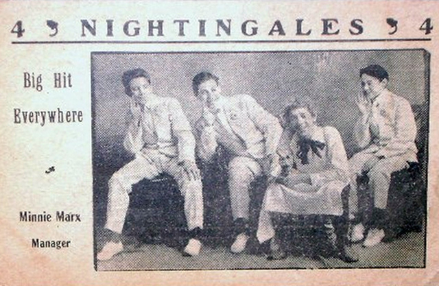 Το 1905, ο Γκράουτσο κάνει το ντεμπούτο του ως τραγουδιστής σε νούμερα του βοντβίλ, ενώ μέχρι το 1907 αυτός και ο Gummo τραγουδούσαν μαζί στη σκηνή ως μέρος του «The Three Nightingales» (με τρίτη τη Mabel O’Donnell). Την επόμενη χρονιά, ο Χάρπο γίνεται το τέταρτο μέλος των «Four Nightingales» πια.