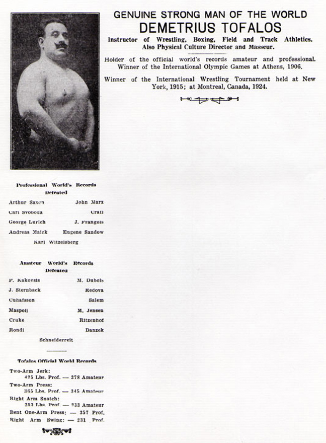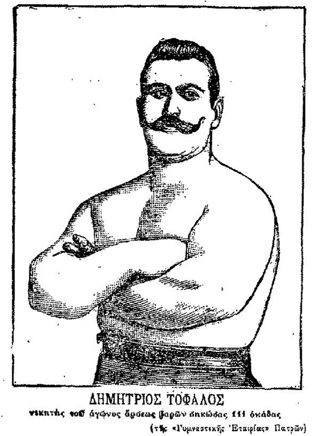 Γέννημα-θρέμμα Πατρινός, ο θρυλικός Τόφαλος απέσπασε το χρυσό μετάλλιο στην άρση βαρών στους Μεσολυμπιακούς της Αθήνας το 1906, για να στεφθεί αργότερα πολυνίκης στην Αμερική στην ελεύθερη πάλη (κατς), κατακτώντας όχι λιγότερα από 251 μετάλλια!