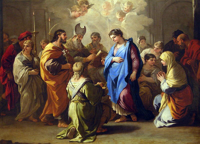 Πριν η Θεοτόκος Μαρία γίνει δεκαπέντε ετών, και καθώς οι γονείς της είχαν στο μεταξύ πεθάνει, οι ιερείς του ναού της φρόντισαν να την αποκαταστήσουν. Προέκριναν ως καταλληλότερο σύζυγο τον Ιωσήφ από τη Ναζαρέτ. Ο αρραβώνας του Ιωσήφ με τη Μαρία ήταν ειδική περίπτωση, αφού κατά μία εκδοχή, η Παρθένος Μαρία δόθηκε στον Ιωσήφ ως μνηστή του από τον Άγιο Ζαχαρία, αρχιερέα του ναού και προστάτη της Παναγίας (θείου ουσιαστικά της Μαρίας και αργότερα πατέρα του Προδρόμου), με σκοπό ο Ιωσήφ να την προστατεύσει και όχι να την κάνει σύζυγό του.