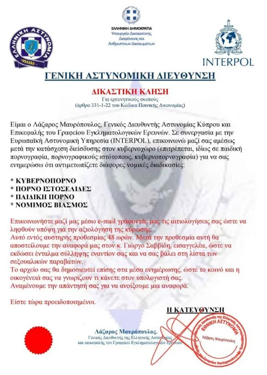 Μάλιστα, στην προσπάθειά τους να προσδώσουν «αληθοφάνεια» στη σχετική επιστολή, χρησιμοποίησαν το λογότυπο του Υπουργείου Προστασίας του Πολίτη, της Ελληνικής Αστυνομίας και της Interpol, εντύπωμα σφραγίδας της Κύπρου με δήθεν υπογραφή του Αρχηγού της Ελληνικής Αστυνομίας, επιχειρώντας να δημιουργήσουν την εντύπωση ότι προέρχεται από την Ελληνική Αστυνομία.