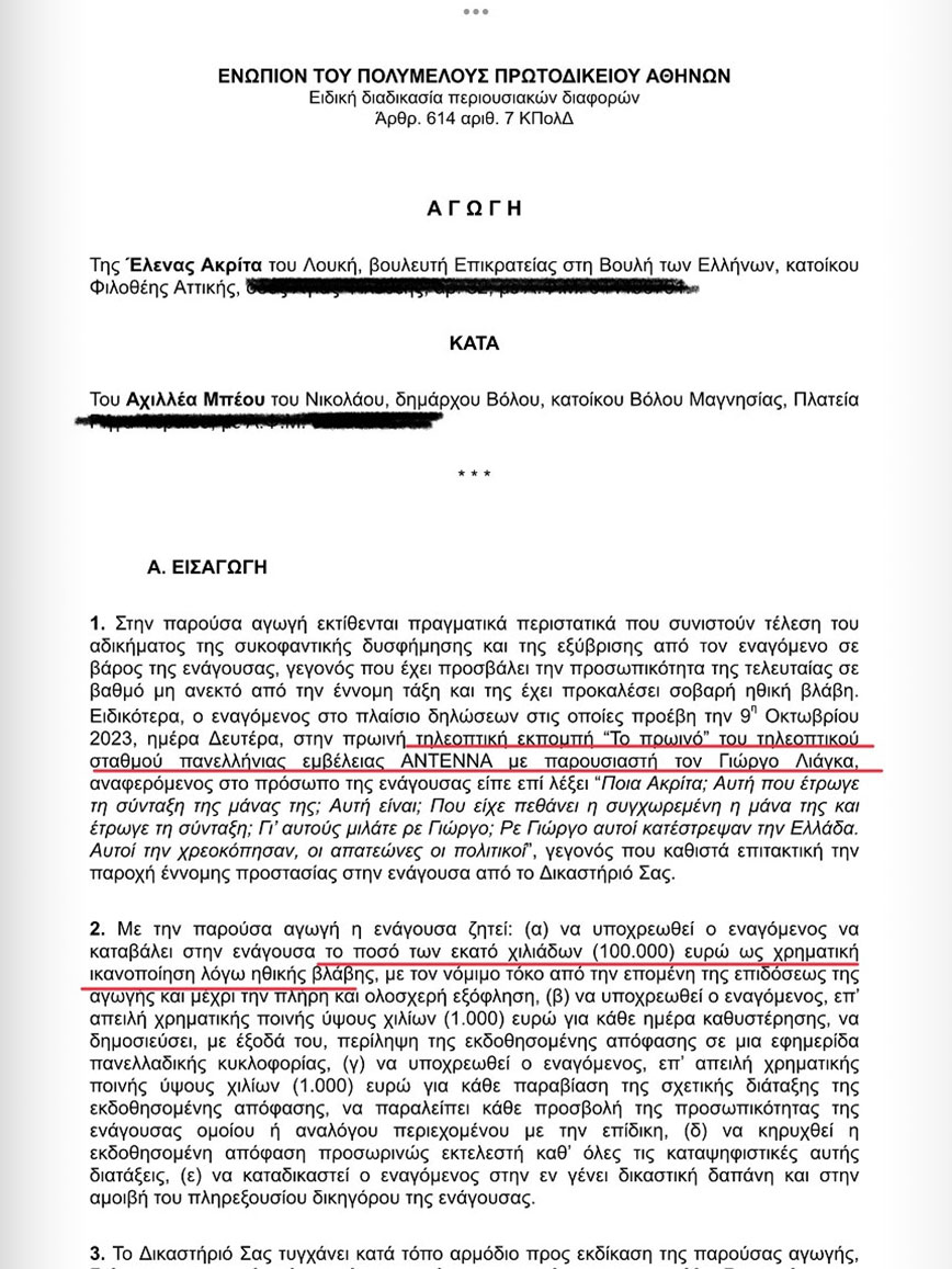 Το ομοφοβικό παραλήρημα ακροδεξιάς ρητορικής του Αχιλλέα Μπέου το βράδυ της Κυριακής έχει ήδη προκαλέσει την παρέμβαση του Αρείου Πάγου. Η Έλενα Ακρίτα με την αγωγή της, με την οποία ζητάει από τον Αχ. Μπέο το ποσό των 100.000 ευρώ ως αποζημίωση λόγω ηθικής βλάβης και θα εκδικαστεί τον προσεχή Φεβρουάριο, θέλει να καταστήσει από την πρώτη στιγμή σαφές το εξής: Εάν ο επανεκλεγείς δήμαρχος Βόλου νομίζει ότι μπορεί να τραμπουκίζει και να εκτοξεύει τον προσβλητικό, ομοφοβικό, σεξιστικό, αισχρό και κακοποιητικό του λόγο προς πάσα κατεύθυνση, πλανάται πλάνην οικτρά. Αυτός ο κατήφορος μπορεί και πρέπει να σταματήσει. Η Δικαιοσύνη έχει τον λόγο».