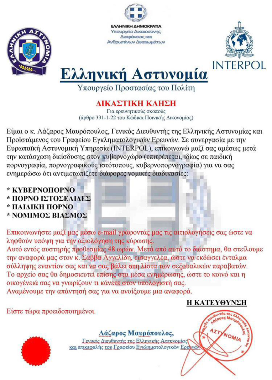 Μάλιστα, χρησιμοποιώντας λογότυπα της Ελληνικής Δημοκρατίας, του Υπουργείου Δικαιοσύνης, του Υπουργείου Προστασίας του Πολίτη, της Ελληνικής Αστυνομίας, της Interpol κ.λπ. και δήθεν υπογραφή του Αρχηγού της Ελληνικής Αστυνομίας, επιχειρούν να προσδώσουν «αληθοφάνεια» στη σχετική επιστολή και να δημιουργήσουν την εντύπωση ότι προέρχεται από την Ελληνική Αστυνομία.