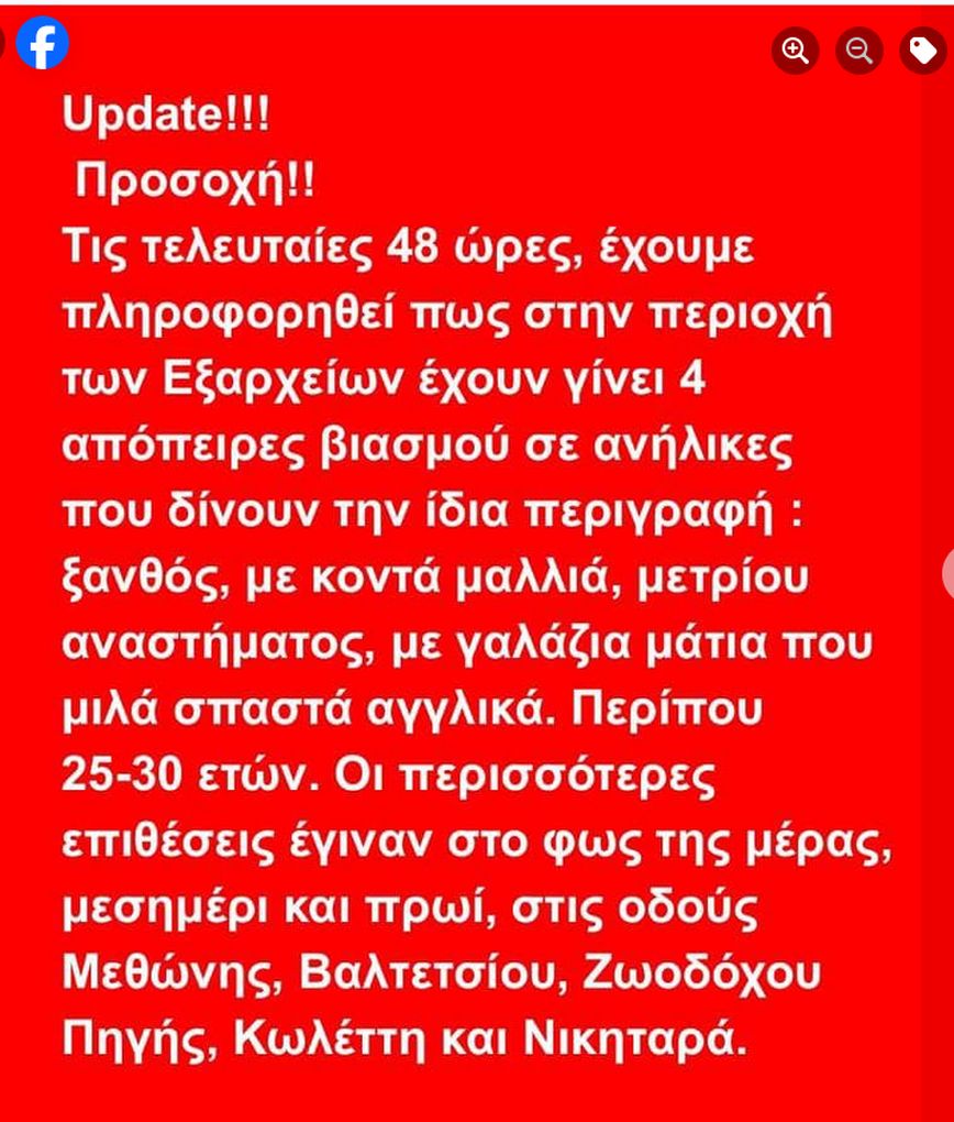 «Τις τελευταίες 48 ώρες, έχουμε πληροφορηθεί πως στην περιοχή των Εξαρχείων έχουν γίνει 4 απόπειρες βιασμού σε ανήλικες που δίνουν την ίδια περιγραφή: ξανθός, με κοντά μαλλιά, μετρίου αναστήματος, με γαλάζια μάτια που μιλά σπαστά αγγλικά. Περίπου 25-30 ετών. Οι περισσότερες επιθέσεις έγιναν στο φως της μέρας, μεσημέρι και πρωί, στις οδούς Μεθώνης, Βαλτετσίου, Ζωοδόχου Πηγής, Κωλέττη και Νικηταρά», αναφέρει χαρακτηριστικά μια ανάρτηση στο Facebook.