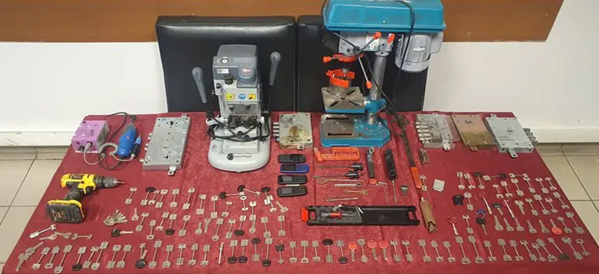 Ακόμη κατασχέθηκαν μία επαγγελματική μηχανή κοπής – αντιγραφής κλειδιών ασφαλείας, ένα τρυπάνι, μία επαγγελματική συσκευή παραβίασης θωρακισμένων θυρών, δύο ηλεκτρικές συσκευές λείανσης με πλήθος εξαρτημάτων, πλήθος κλειδιών διαφόρων τύπων, μία επαγγελματική συσκευή παραβίασης θωρακισμένων θυρών και πλήθος «άκοπων» κλειδιών, που προορίζονταν για αντιγραφή. Επιπλέον, κατασχέθηκαν συνολικά πέντε οχήματα, που χρησιμοποιούσαν για τη μετάβασή τους στους τόπους διάπραξης των παράνομων πράξεων, τη διαφυγή τους και τη μεταφορά των κλοπιμαίων.