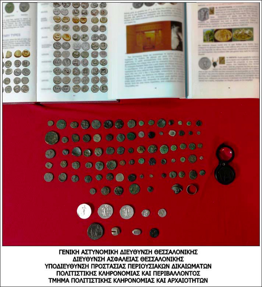 Αναλυτικότερα, σύμφωνα με γνωμάτευση αρμόδιου αρχαιολόγου της ανωτέρω αρχαιολογικής Υπηρεσίας και όπως μεταδίδει η ΕΡΤ τα κατασχεθέντα νομίσματα ανήκουν, κατά περίπτωση, στην αρχαιοελληνική περίοδο (5ος αιώνας π.Χ. – 1ο αιώνα π.Χ.), στη ρωμαϊκή αυτοκρατορική περίοδο (1ο αιώνα π.Χ.-3ο αιώνα μ.Χ.), στη βυζαντινή περίοδο (4ος αιώνας μ.Χ.-13ο αιώνας μ.Χ.) και στην οθωμανική περίοδο (15ος αιώνας μ.Χ.-18 αιώνα μ.Χ.) και το αρχαίο δακτυλίδι κατά την ιστορική περίοδο 4ου αιώνα π.Χ. – 5ο αιώνα μ.Χ..