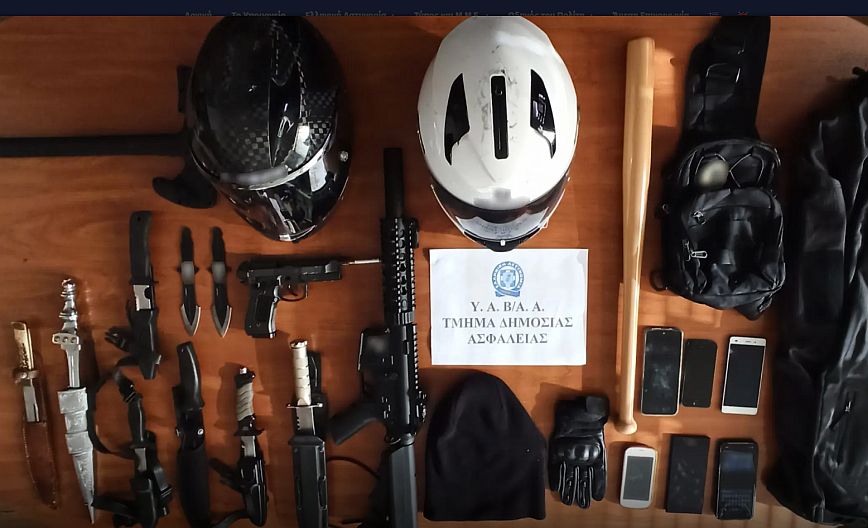 •9 μαχαίρια, ξιφίδιο, ξύλινο ρόπαλο, αεροβόλο πιστόλι και τυφέκιο, τσεκούρι,