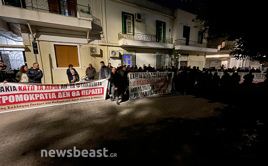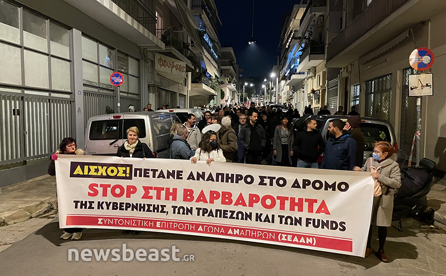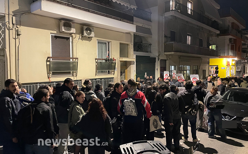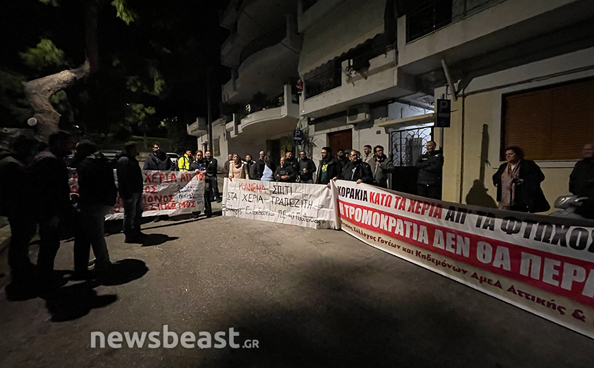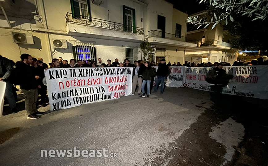 «Έξω τα κοράκια από τις γειτονιές μας» και «Κανένα σπίτι στα χέρια τραπεζίτη» φωνάζουν οι διαδηλωτές, εκφράζοντας με αυτό τον τρόπο την αλληλεγγύη τους σε μητέρα και γιο που πετιούνται έξω από το σπίτι τους.