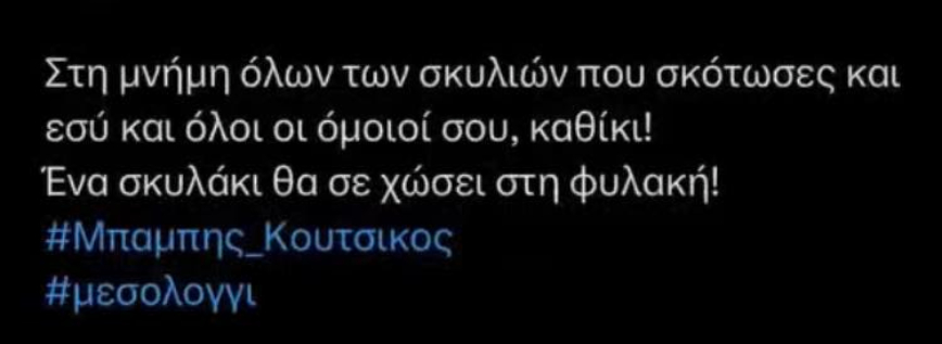 Οι Μεσολογγίτες δημοσιεύουν φωτογραφίες του 50χρονου κατηγορούμενου. Σχολιάζουν τις τελευταίες του κινήσεις και αφήνουν αιχμές πως πρόκειται για ένα άτομο βίαιο, που κακοποιούσε και σκότωνε σκυλιά. Ενδεικτικό των όσων επισημαίνουν για τον κρεοπώλη είναι ένα μήνυμα που δημοσιεύουν στο Facebook και γράφει «Στη μνήμη όλων των σκυλιών που σκότωσες και εσύ και όλοι οι όμοιοί σου, καθίκι! Ένα σκυλάκι θα σε χώσει στη φυλακή», ενώ χρησιμοποιούν τα hashtags #Μπαμπης_Κουτσικος και #Μεσολογγι.
