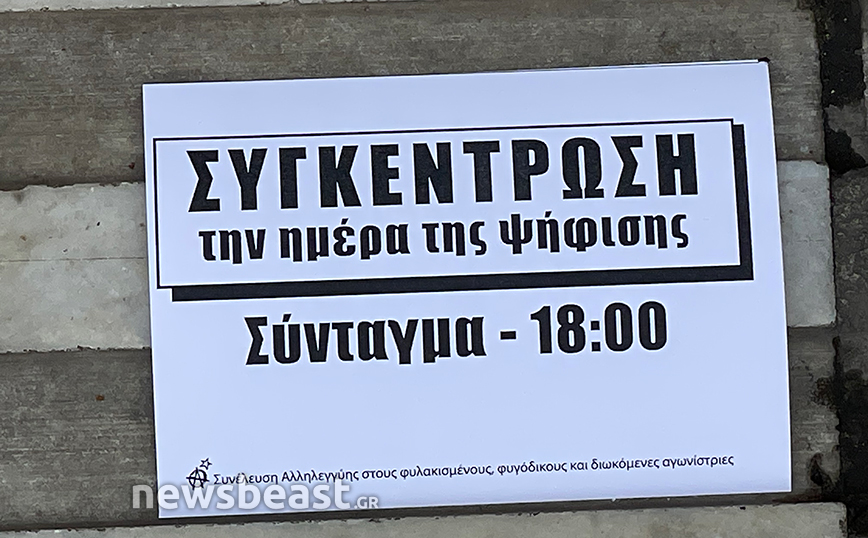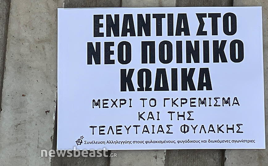 Το πανό καλεί σε συγκέντρωση στις 18:00 το απόγευμα στο Σύνταγμα, την ημέρα ψήφισης του νέου ποινικού κώδικα.