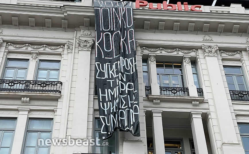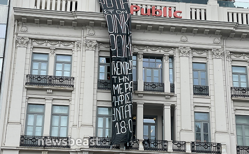 Ομάδα αναρχικών με… καταδρομική κίνηση μπήκε στο πολυκατάστημα Public του Συντάγματος, ανέβηκε στον 6ο όροφο και εκεί άνοιξε πανό.