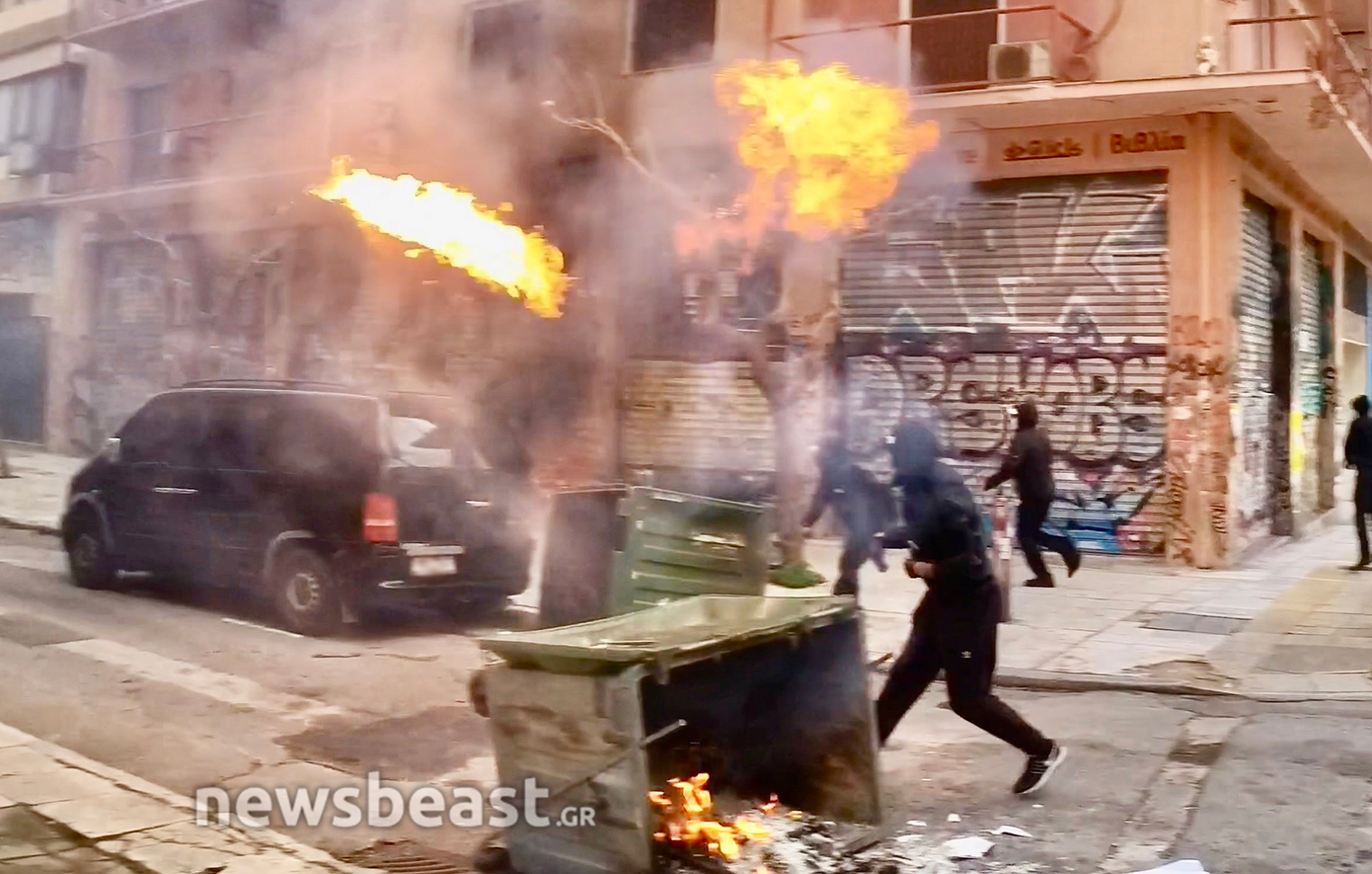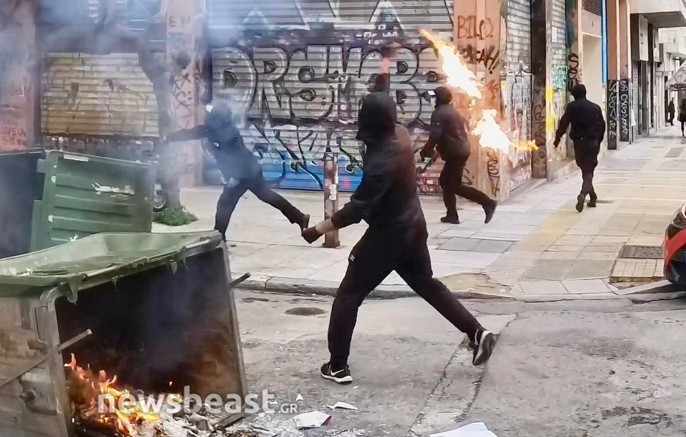 Περίπου 20 νεαροί, στη γωνία Βασιλίσσης Σοφίας και Πανεπιστημίου, πέταξαν μολότοφ προς την πλευρά της Βουλής.