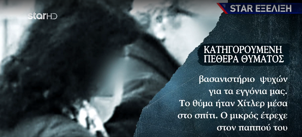 «Είναι πολλά συσσωρευμένα όλα αυτά τα χρόνια. Παλινωδίες, επιθέσεις, βρισιές, χειρονομίες, βασανιστήριο ψυχών για τα εγγόνια μας. Το θύμα ήταν Χίτλερ μέσα στο σπίτι. Ο μικρός έτρεχε στον παππού του και του έλεγε “βοήθα μας παππού γιατί αν δεν μας βοηθήσεις εσύ, όταν μεγαλώσω εγώ θα τον σκοτώσω» είπε χαρακτηριστικά.