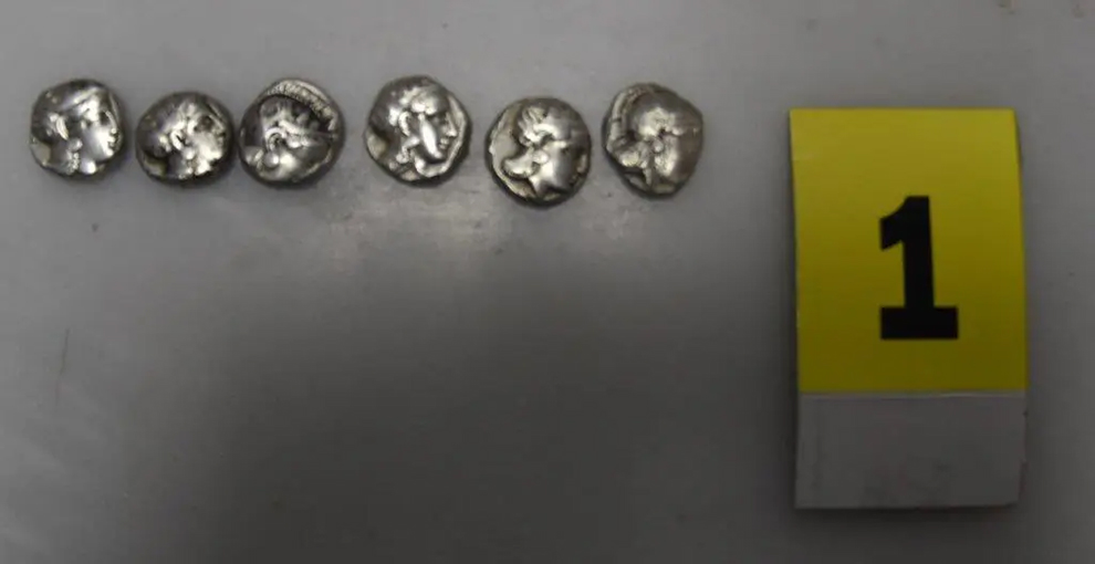 - έξι αργυρά αθηναϊκά τετράδραχμα, που απεικονίζουν στην εμπρόσθια όψη κεφαλή Αθηνάς με κράνος προς δεξιά, στην οπίσθια όψη γλαύκα που βαδίζει προς δεξιά και επιγραφή “ΑΘΕ”