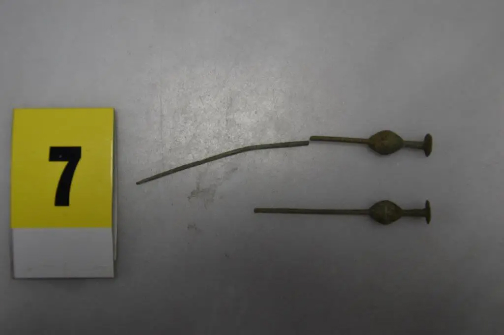 - δύο μπρούτζινες περόνες, εκ των οποίων η μία είναι σπασμένη σε δύο κομμάτια