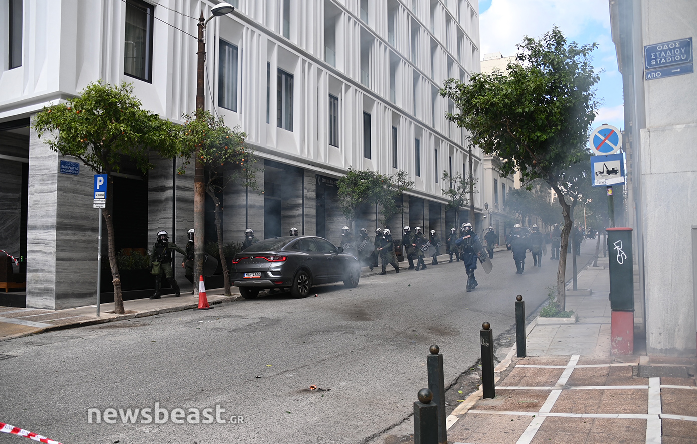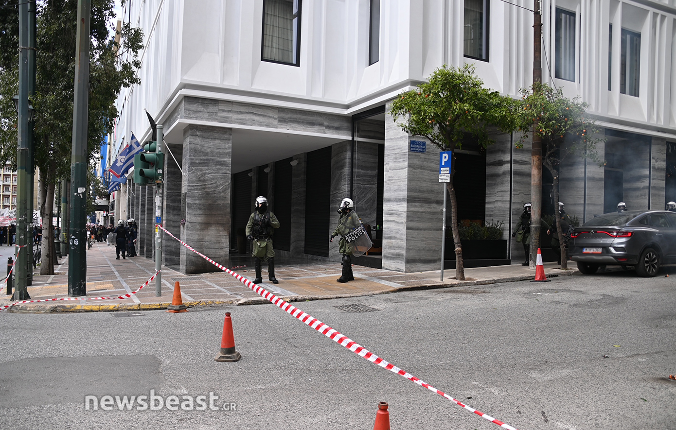 Ομάδα που φαίνεται να έχει αποκοπεί από το σώμα της πορείας εκτόξευσε μολότοφ ενάντια σε ξενοδοχεία ισραηλινών συμφερόντων στη Σταδίου.